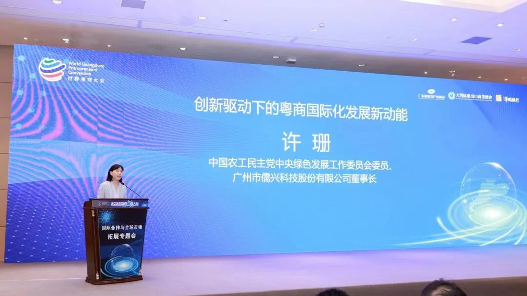 中國農工民主黨中央發展工作委員會委員、廣州市儒興科技股份有限公司董事長許珊圍繞“創新驅動下的粵商國際化發展新動能”,強調了創新在粵商國際化進程中的核心地位,鼓勵企業加大研發投入,提升自主創新能力,以創新引領國際化發展。