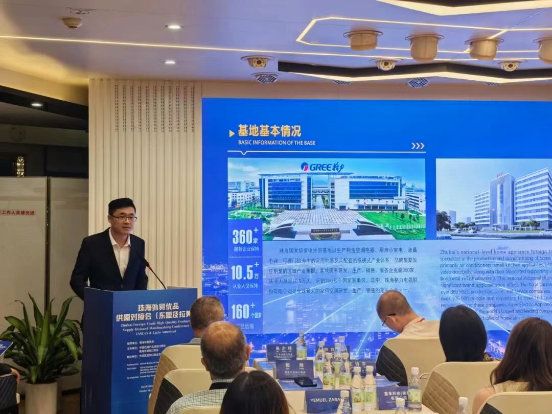 在推介環節,珠海市進出口商會常務副會長兼秘書長郭翔重點介紹了珠海國家外貿轉型升級基地(家電)的產業生態與創新能力。格力電器與夏單科技作為企業代表,分別展示了在空調、智能互動投影與解決方案等領域的前沿技術和產品實力。