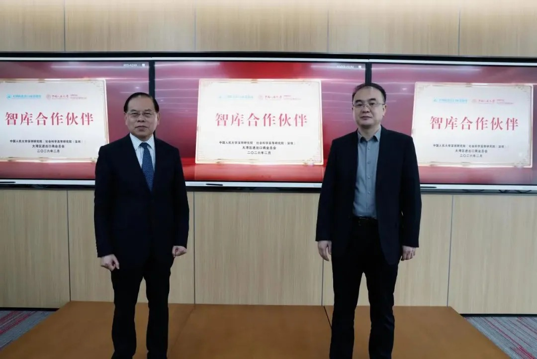 2026年2月28日,大灣區進出口商業總會名譽會長蔡毅協同9+2城市商協會會長一行前往中國人民大學深圳研究院前海院區開展調研暨座談活動。深圳研究院常務副院長、社會科學高等研究院(深圳)執行院長宋科等代表出席活動,雙方圍繞產學研協同、智庫服務、人才培養等議題深入交流,並舉行智庫合作夥伴揭牌儀式。